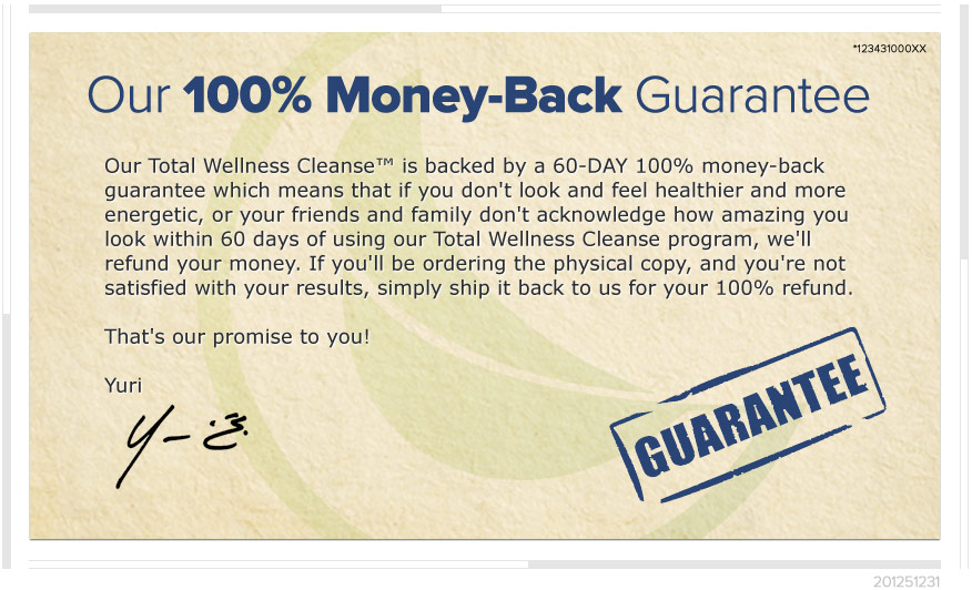 P.P.S. You can enjoy the Total Wellness Cleanse in TWO ways - physical (we'll ship it to you AND pay for shipping) or digital (instant download in MP3 and PDF formats). The choice is yours. Choose which one you'd like to get started with below - whichever you choose, you're covered by our 100% money back guarantee!